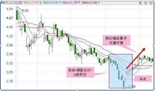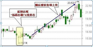 股价深幅下挫,在低档收出大中阴线,次日向下跳空拉出一根长下影线,表示在低档已经有主力大量接盘,支撑十分强劲,多为买入信号,预示后市将反弹。第三日若开出高盘,则可视为反弹开始。此K线组合的上下影线前后皆无遮拦,犹如宝剑已经出鞘,即将斩妖伏魔,故称“扬眉出鞘”。