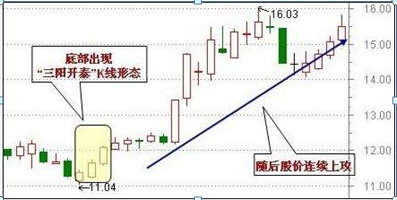 股价在低档经过较长时间的整理之后,连续走出三根小阳线,形成“红三兵”走势,这是一波行情启动的信号。此K线组合的三根小阳线的收盘价逐日向上移动,且多半属于当天的较高价格为,武士勇往直前的形象跃然纸上,底部趋升的形式甚为明显,故称“三阳开泰”。