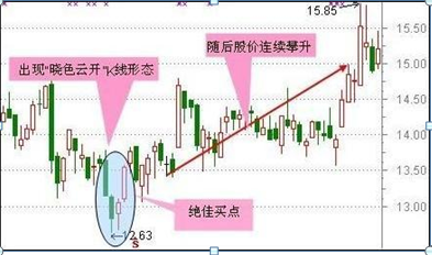 在连续下挫行情中,股价在低位收出大阴,空方大获全胜。次日却被多头打个措手不及,以高价开盘并最终红盘报收。此K线组由阴孕阳构成,犹如雨后虽然乌云满天,却已遮不住太阳的光芒,正所谓“晓色云开,春随人意,骤雨才过还晴”,故称“晓色云开”。