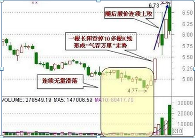 股价在低档持续小幅无量滑落,某一日正常开盘后拔地而起,报收大洋心啊,统吃此前近10根K线,成交量亦放出巨量。此K线组合往往是受某些突发性消息的刺激,主力机构匆匆忙忙拉高建仓的表现。由于此巨量长阳来势凶猛,一举扭转颓势,正如古诗所言“金戈铁马,气吞万里如虎”,故称“气吞万里”。