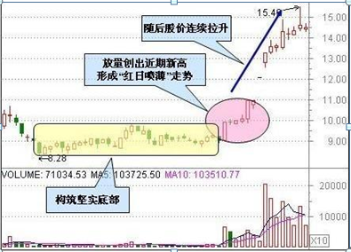 股价经长时间横盘整理后,底部已经构筑得十分坚实,向上突破只是时机问题。果然,某一日股价被放量拉抬,以长阳报收,创出近期新高。从图形上来看,其前的横盘区域价位相差无几,犹如地平线一样,而带量长阳犹如一轮红日从海面上喷薄而出,故称“红日喷薄”。该K线形态是低档长期盘整后的突破信号,预示后市股价将大涨。