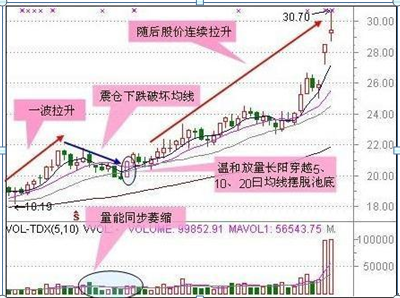 猪笼入水是指个股经过低位收集后开始的猛烈拉升,在高位形成尖顶后,单边下行不做头部的确认动作,在接近60日或150日均线时,以一根中阴线向下突破,走势吓人,但5曰乖离率出现明显背离,这是缩量洗盘结束的最佳买点。随之而来的将是一波向上攻击前期高点的行情。