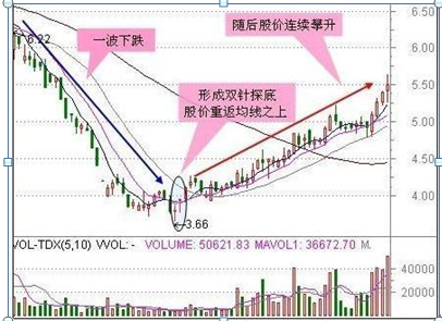 股价在前期放量上涨后,缩量回调,在大均线附近出现两次下影K线组合,谓之双针探底,一旦股价重返短期均线上方,往往将转入急攻行情,所以在第二次出现下影十字星线的大均线附近是较佳低吸点。