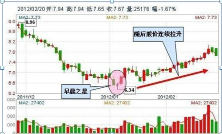 此种K线图形由三根K线构成。第一日股价承接原有跌势继续下行,并出现一根实体较长的阴线;第二日股价波幅缩小,收出实体较短带上下影线的阴线或阳线,称之为“星”,这是K线组合中的主体部分;第三日收出阳线,而且上涨至第一根K线实体之内,这是转市可靠性最高,力度最强的一种K线组合。