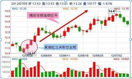 “红三兵”是一种很常见的K线组合,这种K线组合在下跌趋势中出现时,一般是市场的强烈反转信号。先于大盘企稳并出现“底部红三兵”走势的个股尤其值得我们注意,这通常是主力提前进场的重要信号之一。