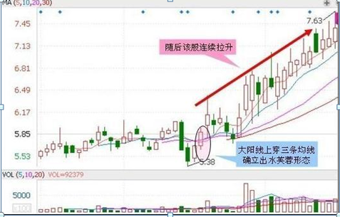 此K线形态也是一根大阳线,但是这根大阳线上穿三条均线,使均线呈现多头排列形态,后势极端看涨。三条均线指5日10日20日,这是一个中期或波段式的上涨行情,缩量回调是买进时机。
