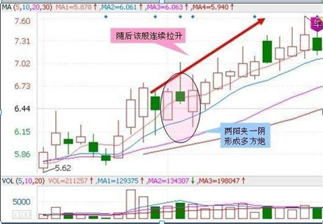 此K线组合上呈现两阳夹一阴的形态,还有以此演变出来的一种三阳夹二阴的图形,戏称为叠叠多方炮。